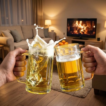 一群人手握装满金黄色啤酒的玻璃杯相互碰杯,杯壁上布满细密气泡,啤酒表面泛着洁白泡沫,阳光透过玻璃杯折射出温暖光泽,背景是户外音乐节现场,舞台上灯光绚丽,台下人群随着音乐舞动,空中漂浮着彩色气球和音符装饰,整体画面呈现出明亮欢快的氛围,光影效果柔和自然,色彩饱和度高,充满热闹欢庆的聚会气息。