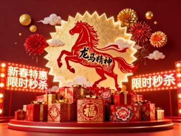 国潮剪纸风融合浮雕鎏金质感,红金主色调营造喜庆中式氛围,龙马精神主题搭配礼盒堆叠与霓虹灯牌,强化新春促销视觉冲击力。