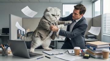拟人风猫咪身穿西装,与商务男士在办公室激烈对峙,超现实主义场景融合3D质感与实景细节,展现职场张力。