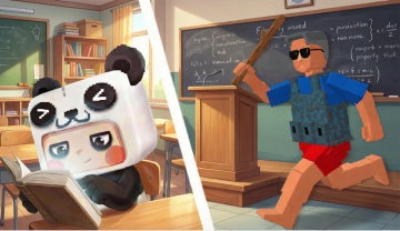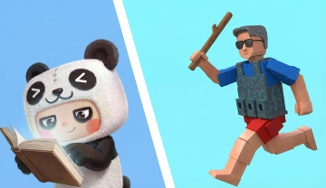 像素风虚拟现实世界,卡通人物在清新山水间嬉戏,营造梦幻互动体验。