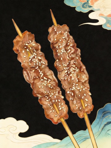纯手绘素描风格的烤羊肉串插画,黑色铅笔线条勾勒,线条粗细变化明显,有清晰的阴影和明暗对比以增强立体感,肉质纹理通过交叉线条和块状笔触表现,三串羊肉串呈交错排列,金属签子细长尖锐,整体画面简洁,背景为纯白色,无其他装饰元素,构图聚焦于羊肉串本身,展现出食物的质感和手绘的艺术感。
