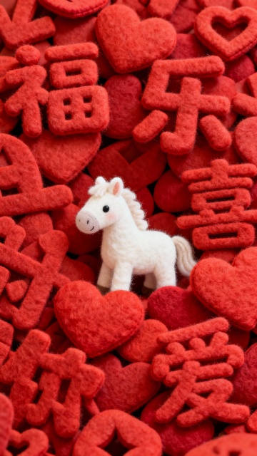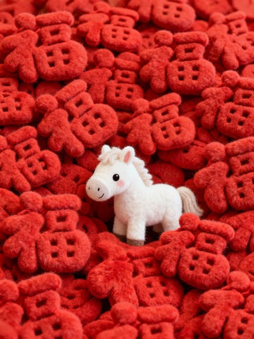 治愈插画,绘本毛绒质感插画,,红包背景,满屏的形态各异红色福字,紧密堆叠在一起,中间露出一头可爱的萌萌白色小马,极简主义,高清画质,8K,生4张