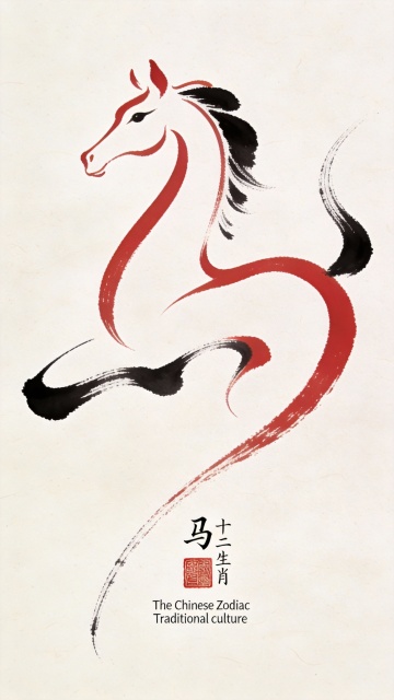 中国十二生肖之马的抽象表达,极具艺术造诣,夸张变形,手绘感强,现代简约线条艺术,拉长的艺术曲线,曲线延伸飘逸,造型夸张神似马的书法字,极致简约概括手绘毛笔线条,红色和黑色线条为主,流畅飘逸的线条质感,搭配小号草书书法手写字体的“马”,极小号宋体字“十二生肖”文字元素,添加传统红色印章,添加极小高英文“The Chinese Zodiac ”与“Traditional culture”,简洁白色背景