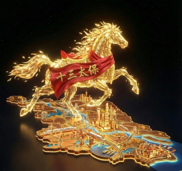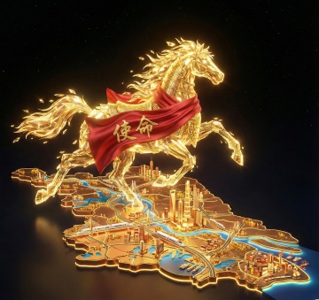 未来感与中式美学融合的3D玻璃马,几何线条勾勒科技纹路,虚拟现实质感,立体主义呈现新春贺岁主题。