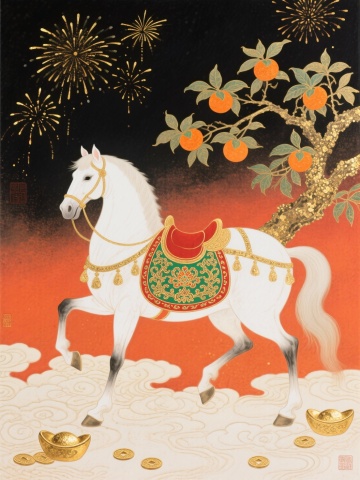 鎏金浮雕风骏马,工笔描边勾勒祥云瑞气,国潮复古中透出奢华喜庆,福字点缀,尽显中式年味。