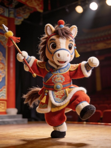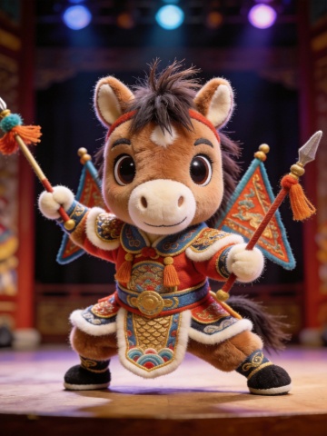 一只穿着京剧戏服的可爱的唐代毛绒马,拟人化,现实风格,疯狂的细节,毛茸茸的,超清晰的毛发,大眼睛,全身照,在戏台上耍着戏曲里的花枪,摆着动作表演,对着镜头,Q版超萌,超高清,杰作,生4张