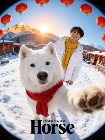 国潮风萌犬迎新春,刺绣“年福”发箍配金元宝项圈,鎏金背景映衬喜庆红毯,萌趣十足的中式新年氛围。