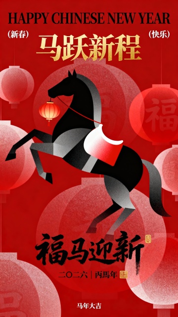 国潮风融合几何剪影,鎏金文字与红底灯笼营造喜庆中式氛围,水墨笔触点睛“福马迎新”,传递马年新春的吉祥祝福。