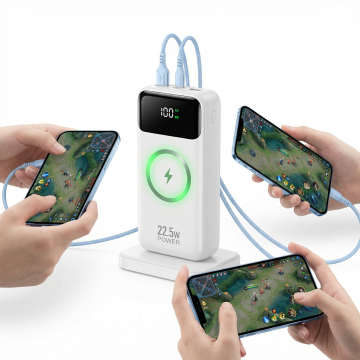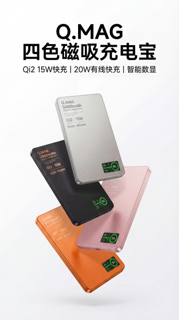一个简约现代风格的白色充电宝,采用光滑细腻的哑光材质,边缘圆润处理,正面有品牌logo和四个电量指示灯,底部配备两个USB-A接口和一个USB-C接口,轻盈悬浮在流动感十足的白色丝绸背景上,背景采用柔和的浅灰色渐变,整体画面干净通透,光线从左上方柔和照射,在充电宝右侧和丝绸褶皱处形成自然的高光与细腻阴影,营造出优雅、科技感与质感并存的氛围,构图以充电宝为视觉中心,丝绸背景呈波浪状环绕,凸显产品的简洁设计与高端品质。