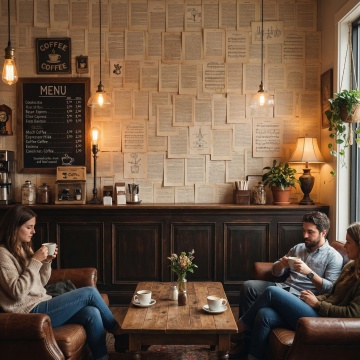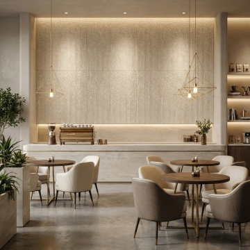 现代工业风餐饮空间室内设计,深灰色金属裸露天花板搭配黑色金属框架吊灯,暖黄色灯光营造温馨氛围,地面采用蓝灰色与浅木色交错拼接的人字形几何图案地板,浅色砖墙与深色木质餐桌椅组合,多种颜色餐椅(灰色、蓝色、米色)围绕圆形木质桌面,开放式吧台区域可见食品陈列,整体空间布局通透,视觉层次分明,兼具工业粗犷感与舒适用餐氛围,适合快餐或休闲简餐厅的餐饮背景场景。