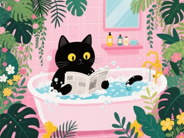 卡通感插画风,几何色块背景,黑猫探头好奇,简约现代设计。