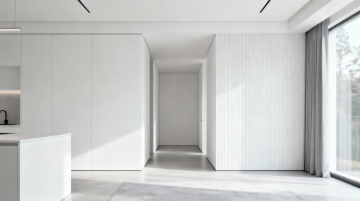 现代感极简空间,清透光影交织,浮雕纹理墙面与简约线条呼应,营造清爽舒适氛围,性冷淡风设计尽显高级质感。