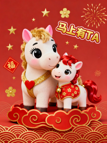 软3D风拟人小马,红金配色喜庆十足,剪纸云纹与鎏金元素点缀,萌趣卡通感满满,传递新年“马上有TA”的甜蜜祝福。