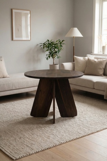 温馨明亮的室内场景,一张不同木纹配色的实木餐桌占据画面中心,桌面光洁平整,展现出自然的木材纹理和温润质感。窗外柔和的自然光透过百叶窗洒入,在桌面上形成斑驳的光影效果,营造出宁静舒适的氛围。餐桌周围摆放着不同的精致摆设,背景中是风格统一但细节不同的木质书架,书架上错落有致地摆放着书籍和装饰品,旁边立着一盏设计简约的台灯,整体构图采用近景聚焦桌面、背景略微虚化的方式,光影柔和,色彩和谐,充满生活气息与温馨感。