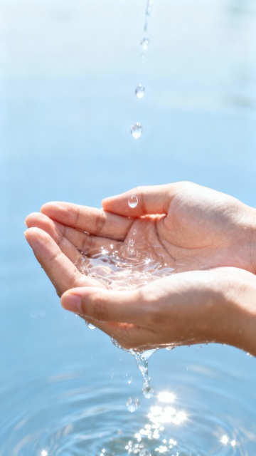 一张高清晰度的水形态创意摄影,以纯净的浅蓝色渐变背景为衬托,水面平静如镜,倒映着上方跃动的水流。画面中央,清澈透明的水从水面向上涌起,凝固成一朵优雅绽放的水晶般水花,水珠晶莹剔透,边缘泛着柔和的高光,细小的水滴如钻石般四散飞溅,悬浮在空气中,呈现出灵动而富有张力的动态瞬间,光影效果柔和自然,营造出宁静、纯净且充满生命力的氛围。