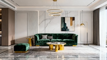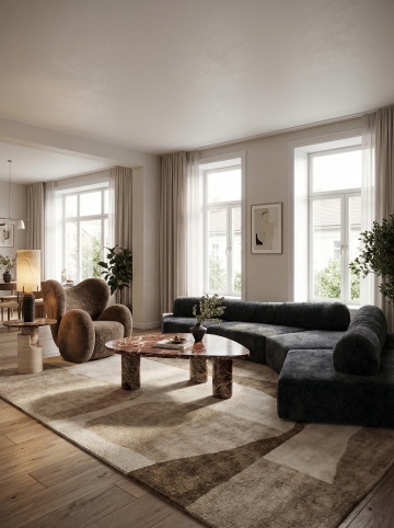 低角度仰拍,极简主义风格客厅室内设计,以冷灰色和深炭黑为主色调,搭配哑光黑色金属框架地板,蓝紫色调的LED光源从右侧几何切割造型的嵌入式灯带均匀投射,营造冷静克制的氛围。房间中央是一个悬浮式深灰色模块组合沙发,沙发上放置两个荧光蓝几何形状靠垫,沙发前铺着高反光黑色大理石纹地毯,地毯上摆放着一个不规则多面体透明玻璃茶几,茶几上有一个棱角分明的金属材质花瓶,插着几支干枯的黑色树枝。沙发左侧靠墙处有一盆叶片尖锐的黑色系观叶植物,种植在六边形混凝土花盆中。沙发上方的墙壁上悬挂着一幅纯黑色极简主义画作,画框为隐形嵌入式设计。天花板上悬挂着一个由多个黑色金属圆环组成的解构主义吊灯。整体空间布局采用悬浮式设计,线条凌厉分明,家具造型极具未来感,材质以金属、玻璃和混凝土为主,光影对比强烈,呈现出冷峻、理性、前卫的居家氛围。