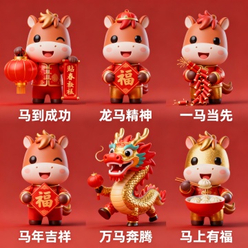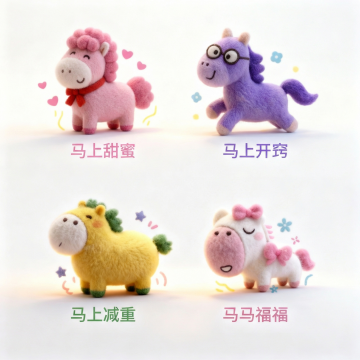 软3D风毛绒小马,拟人化设计,色彩柔和梦幻,充满可爱与趣味感,搭配温馨谐音祝福语,营造节日治愈氛围。
