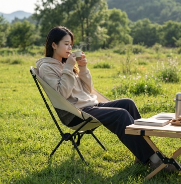一张写实风格的露营场景照片,明亮的阳光下,湖边草地中央搭建着一个米黄色的尖顶帐篷,帐篷前摆放着一套黑色金属框架折叠桌椅,桌面上放着透明玻璃杯。远处是连绵起伏的青灰色山脉,山间点缀着墨绿色的森林,近处湖边有几棵高大的绿色松树,前景是长满黄色野花的绿色草地。天空湛蓝,飘着几缕白色的云朵,整体画面色彩清新明快,光影层次分明,营造出宁静自然、舒适惬意的户外露营氛围。