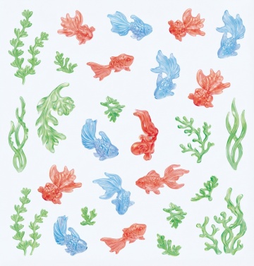 系列水彩风格金鱼插画,保持原水彩笔触的透明晕染质感、灵动飘逸的鱼身姿态和扇形尾鳍特征,以纯色背景呈现6条造型各异的金鱼:1. 橙红渐变鱼身配宝蓝尾鳍,2. 柠檬黄主调点缀靛蓝泼墨,3. 樱花粉鱼身搭配草绿鳍边,4. 湖蓝鱼体融合鹅黄渐变,5. 薰衣草紫与薄荷绿撞色,6. 珊瑚橙点缀孔雀蓝斑点,整体采用网格状规整排布,每幅均保留飞溅的水彩颜料质感和自然晕染效果,光影柔和立体感强。