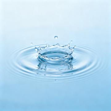 一张高清晰度的水形态创意摄影,以纯净的浅蓝色渐变背景为衬托,水面平静如镜,倒映着上方跃动的水流。画面中央,清澈透明的水从水面向上涌起,凝固成一朵优雅绽放的水晶般水花,水珠晶莹剔透,边缘泛着柔和的高光,细小的水滴如钻石般四散飞溅,悬浮在空气中,呈现出灵动而富有张力的动态瞬间,光影效果柔和自然,营造出宁静、纯净且充满生命力的氛围。