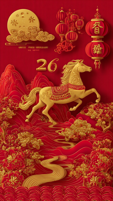 鎏金浮雕骏马跃动,中式古典山水卷轴铺陈,3D重拟物风呈现喜庆奢华,金属质感闪耀2026马年吉祥。