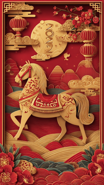 剪纸风与撕纸风结合,红金配色尽显喜庆感,中式元素如灯笼、烟花、祥云与马年主题巧妙融合,浮雕层次营造国潮视觉盛宴,寓意新春吉祥富贵。
