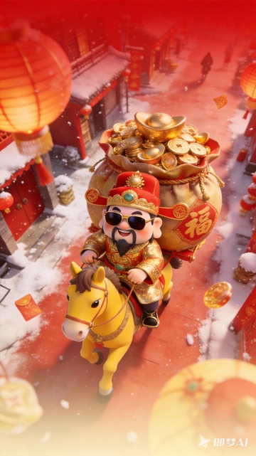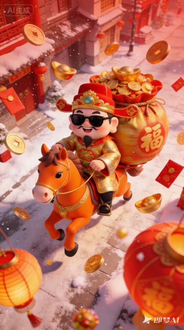 软3D国潮风,卡通财神骑摇马,毛发生长质感,鎏金元素点缀,喜庆红底配烟花与金币,传递春节“马上发财”祝福。