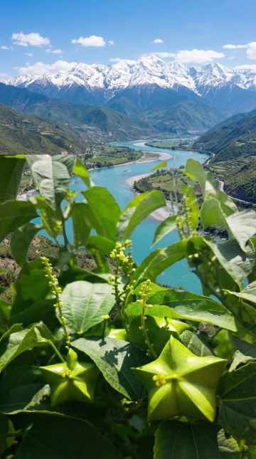 圆形构图融合城市与山水,现代建筑群与自然山川交相辉映,光影流动间展现清新舒适的城市景观,立体肌理增强视觉层次,呈现自然与都市的和谐共生。