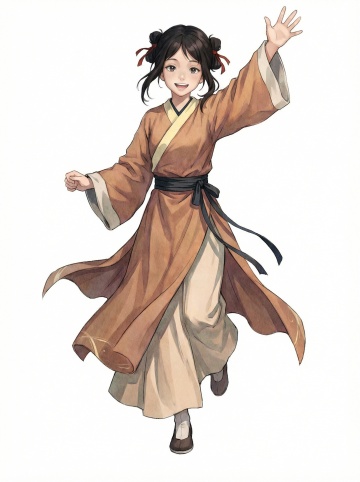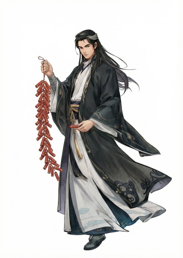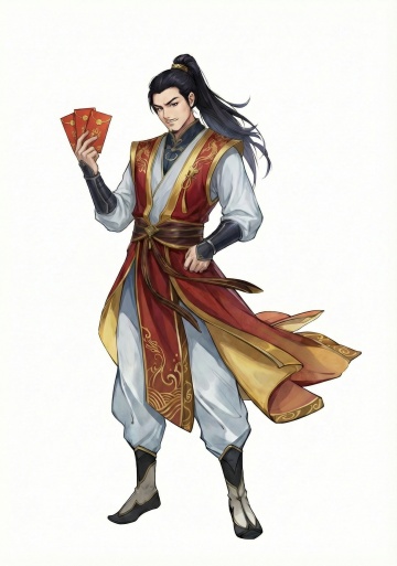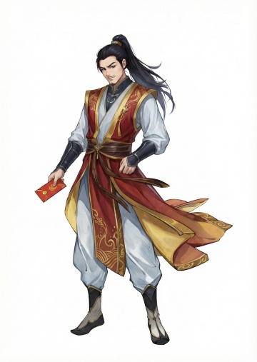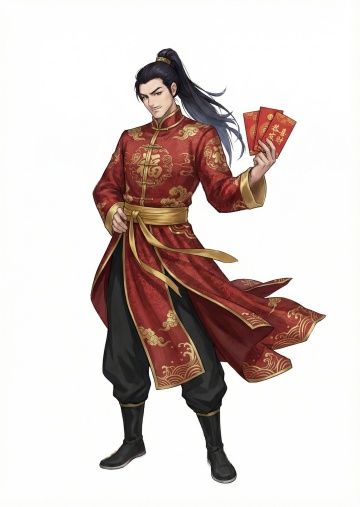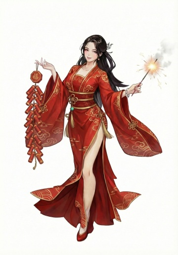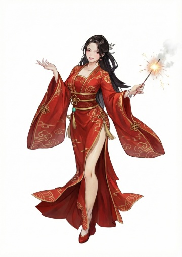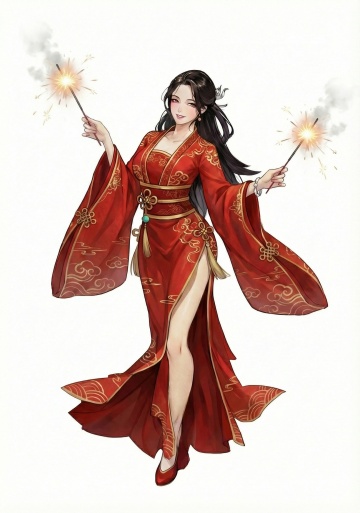 中国风二次元动漫风格,一位身着红色与金色渐变飘逸古风长裙的少女,长发如墨色瀑布般垂落,发间点缀着金色凤凰发饰,右手掌心托着一朵燃烧的金色莲花,莲花周围环绕着红色火焰光晕,左手自然舒展,裙摆与长发随风飘动,姿态轻盈灵动,面部表情温柔恬静,眼神清澈,整体线条流畅细腻,色彩鲜明且具有层次感,光影柔和,背景为纯白色,无其他元素干扰。