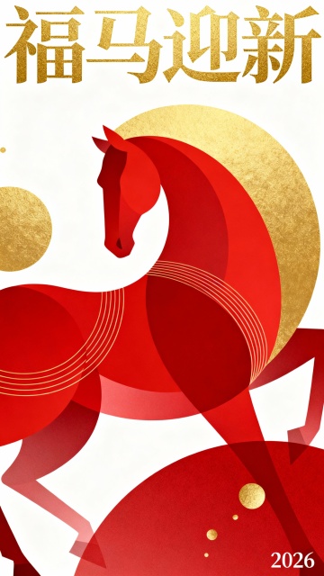 国潮风几何剪纸马,鎏金红韵迎新春,喜庆中式贺2026年。
