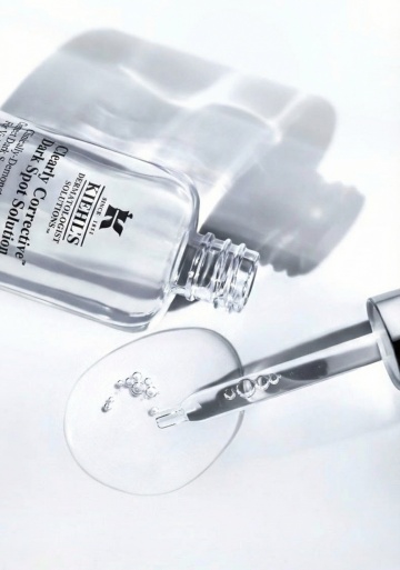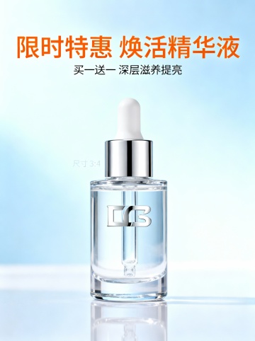 清透玻璃瓶身搭配金属滴管,轻拟物设计展现现代科技感,简约蓝白渐变背景强化清爽质感,橙色促销文案突出限时特惠,整体风格商务且富有高级感。
