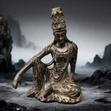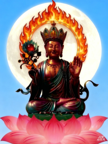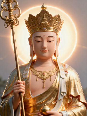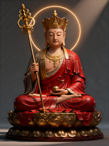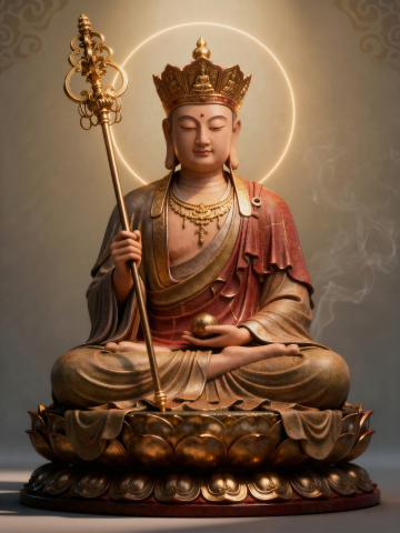 古典中式工笔风,3D角色超现实主义展现,毛发生长风飘逸,佛像背景神秘祥和。