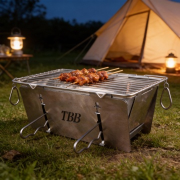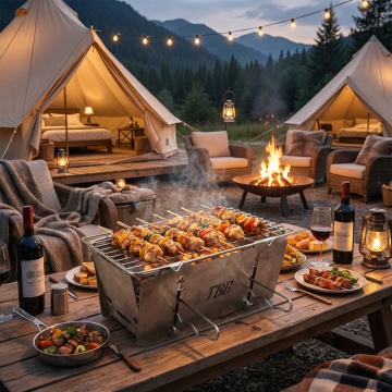 写实风格美食摄影,特写镜头下一位穿着白色围裙的厨师正在户外露营环境中烧烤,左手握着几串滋滋冒油的烤肉串正从炭火上拿起,右手也持着烤串,烧烤架上摆满了各种烤肉和烤蔬菜,火焰熊熊燃烧,升腾起袅袅青烟,肉质呈现出诱人的焦香色泽和清晰纹理,周围是自然的露营场景,有帐篷、树木和户外桌椅,整体色调温暖,光影对比强烈,突出食物的质感和烧烤的烟火气,营造出户外露营烧烤的热闹、惬意氛围。
