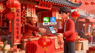 插画风融合国潮与轻拟物设计,剪纸元素点缀,营造喜庆温馨的春节氛围,展现家庭共度年货采购的幸福场景。