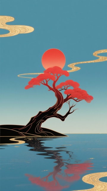 水墨风插画,青绿山水间松下打坐,虚实相生,营造清透柔和的虚拟自然意境。禅意,冥想