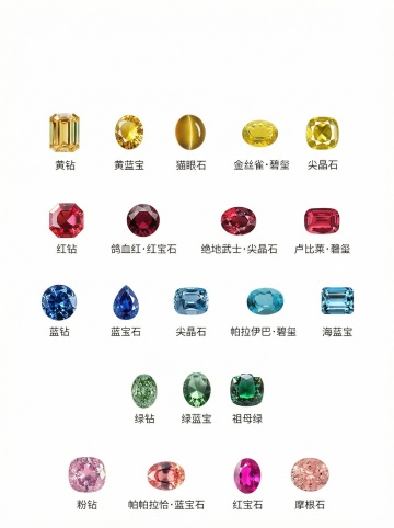 六个规整排布的素材,保持简约现代风格,每个素材包含不同颜色(如红色、蓝色、绿色、黄色、紫色、橙色等)和不同形状(如圆形、椭圆形、方形、心形、水滴形、祖母绿形等)的宝石,宝石具有高光泽度、多切面、晶莹剔透的质感,每个宝石都有金色金属边框,背景为纯色,无任何文字、logo和水印。