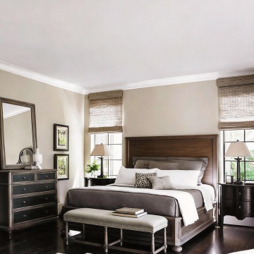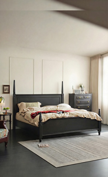 一张现代简约风格的卧室设计图,整体色调为温暖的米白色和浅木色,搭配柔和的自然光线从大窗户洒入,营造出宁静舒适的氛围。房间内有一张铺着白色条纹床单的双人床,床头摆放着简约的床头柜和台灯,床尾处铺着一张米白色的地毯。房间的另一侧是一个白色的梳妆台,上面摆放着一些绿植和装饰品。墙面采用了简约的线条设计,整体空间布局合理,家具摆放整齐有序。