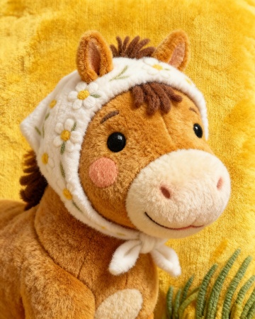 软3D风毛绒小马,拟人化设计,色彩柔和梦幻,充满可爱与趣味感,搭配温馨谐音祝福语,营造节日治愈氛围。