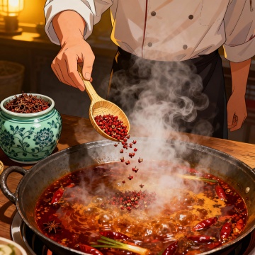 俯视视角,六个不同风格的火锅造型,上下两行整齐排列,浅色背景,第一行从左到右:不锈钢材质的麻辣牛油火锅,沸腾的红汤中漂浮着干辣椒和姜片,金属锅具质感;水彩风格的清汤菌菇火锅,淡褐色汤底,点缀着香菇和枸杞,柔和的笔触晕染效果;手绘卡通风格的番茄牛腩火锅,橙红色汤汁,大块牛腩和番茄块,圆润可爱的线条。第二行从左到右:写实风格的寿喜烧火锅,深色锅底,摆放着肥牛卷和葱段,细腻的光影表现;极简线条风格的椰子鸡火锅,白色汤底,鸡肉块和椰肉,简洁的黑色轮廓;3D渐变质感的冬阴功火锅,橙黄色汤汁,柠檬片和香茅,光滑的材质过渡。每个火锅保持独立清晰,整体构图均衡,色彩丰富多样。