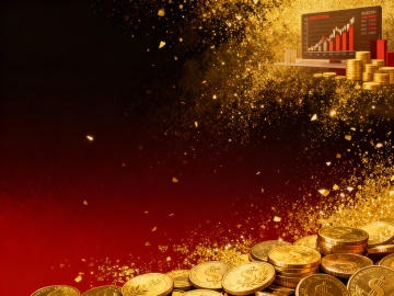 深色背景上,顶部有明亮的金色光点汇聚成发光带,向下扩散出大量细小的金色闪光粒子,营造出梦幻而璀璨的氛围。底部有流畅的金色波浪线条,线条边缘带有柔和的光晕效果,下方是由规则排列的金色光点组成的发光横线,横线两端各有一个明亮的金色光斑,整体画面呈现出科技感与未来感兼具的动态视觉效果,光影层次丰富,金色光芒在深色背景上形成强烈对比,带来华丽而神秘的视觉体验。