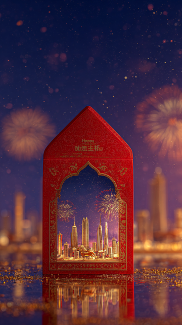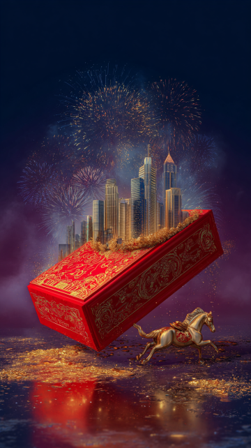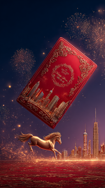 鎏金浮雕风骏马跃动,国潮插画融合烟花、灯笼与金元宝,喜庆奢华,梦幻中式年味尽显。