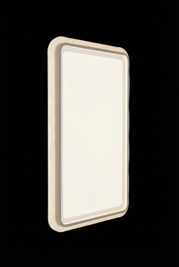 3D渲染的展示场景,极简主义风格,浅色(接近白色)的平滑墙面背景,墙面带有细腻的灰色小点纹理,地面为浅灰色哑光材质,中央放置一个灯箱,灯箱形状变换为优雅的圆角矩形,样式设计为带有轻薄金属质感边框,边框颜色为浅银色,灯箱内部发出均匀柔和的白色光源,底部配有一个与灯箱宽度匹配的低矮白色基座,基座为简洁的长方体结构,整体画面光影柔和,光源来自灯箱内部,投射出轻微的阴影在墙面和地面,营造出干净、现代、专业的展示氛围,构图采用居中对称布局,视觉焦点突出灯箱主体。