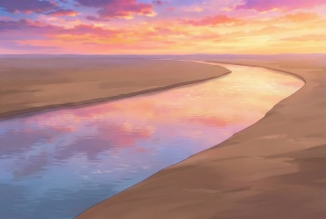 清新动漫风,虚拟自然景观,蓝天碧水,绿野绵延,营造宁静美好氛围。
