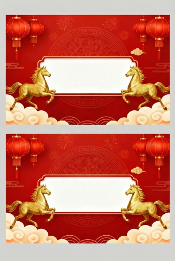 中式复古风海报,红金配色尽显喜庆与奢华,重拟物浮雕马踏祥云,搭配灯笼与中国结,国潮金属质感浓厚,节日氛围浓郁。