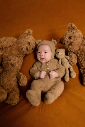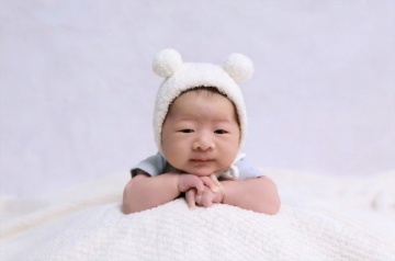 明亮柔和的室内自然光下,一位亚洲婴儿坐在浅色木地板上的白色柔软地垫上,穿着米白色针织连体衣,双手开心地向上举起,脸上洋溢着灿烂的笑容,背景中挂着蓝灰色系的三角旗装饰,整体画面温馨治愈,色调温暖柔和,光线均匀自然,婴儿的皮肤质感细腻,服饰纹理清晰,构图居中,展现出婴儿活泼可爱的瞬间。