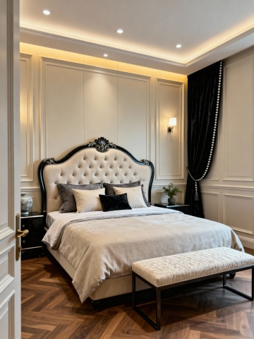 现代简约卧室,木雕风床头搭配柔和光影,性冷淡色调营造舒适温馨氛围,面料质感细腻,节日静谧感扑面而来。