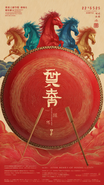 国潮风融合工笔与鎏金技法,黑骏马踏云奔腾,配以葫芦祥云,尽显中式古典奢华与喜庆寓意,大字“马上来福”点睛,传递马年吉祥祝福。