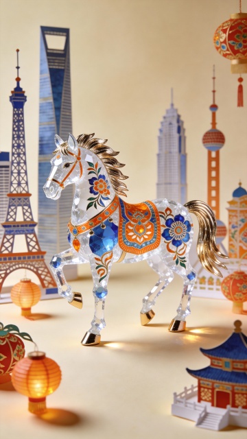 水晶马身披鎏金花饰,融合中式纹样与3D微缩艺术,玻璃质感透出梦幻光晕,喜庆灯笼与地标剪影烘托节日氛围,尽显奢华民族风。
