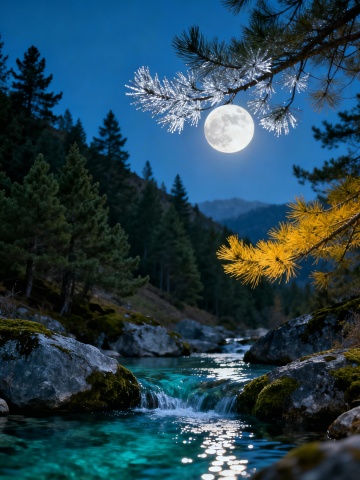 月光洒落山涧溪流,松枝轻拂,冰晶闪烁,光影交织于清透水色中,营造出静谧唯美的梦幻自然景致。