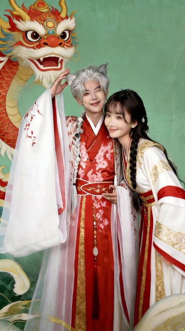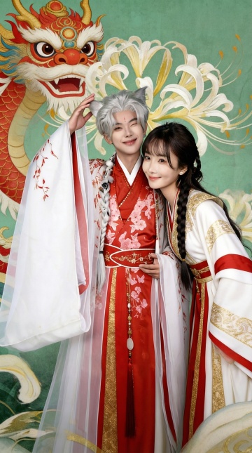 工笔风与刺绣风交融,红白汉服映衬樱花纷飞,中式庭院间红灯笼高挂,营造古典喜庆浪漫氛围,唯美主义演绎传统婚嫁之韵。